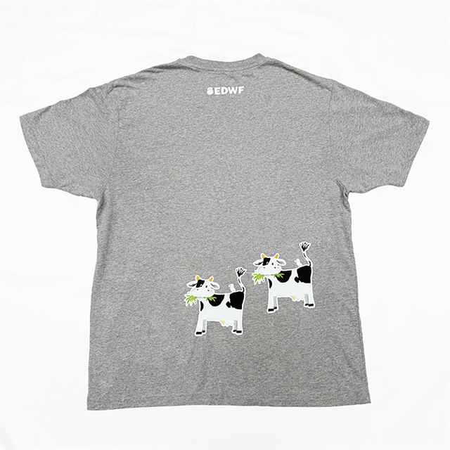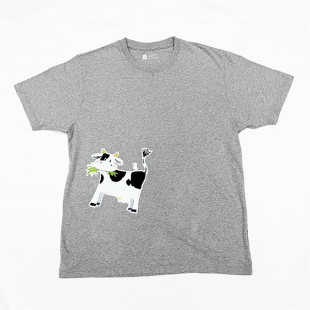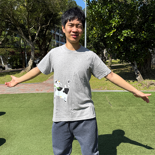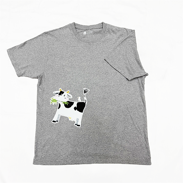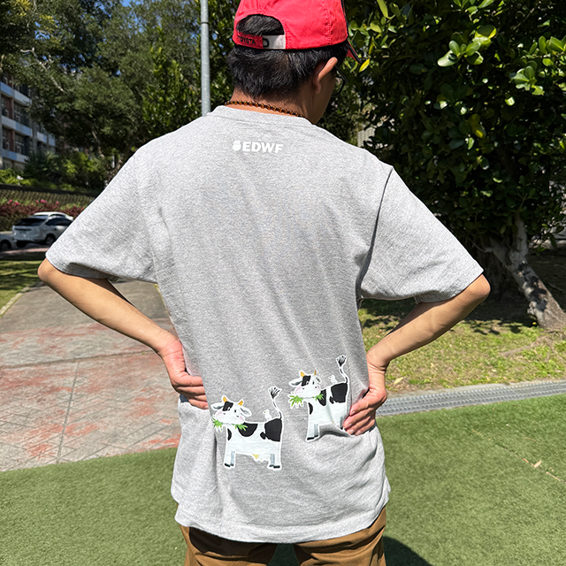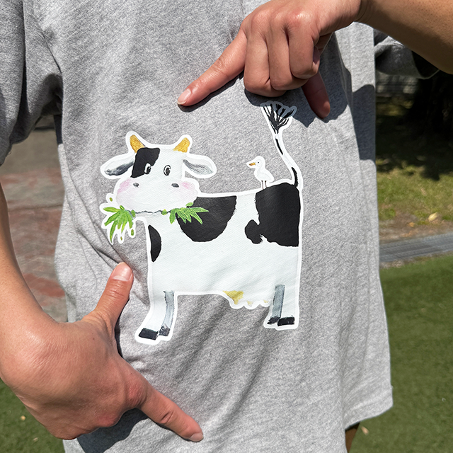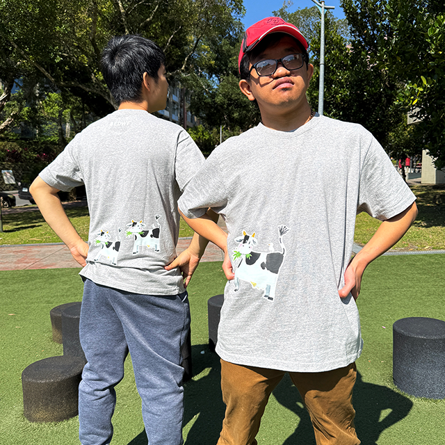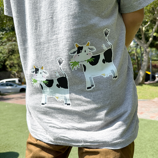 衣服上的圖樣來自於啟賢的畫作《牛牛吃草》,創作靈感來自於日常中最平凡卻最動人的片刻:一隻小牛悠閒地享受青草的時光。畫中柔和的色彩與俏皮的表情,傳遞出純真與自然的美好。